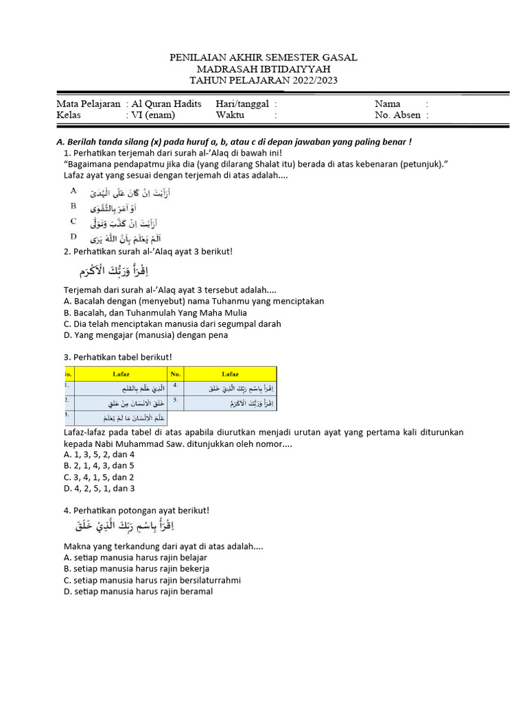 Untuk membantu para siswa dalam mengukur dan meningkatkan pemahaman mereka, ketersediaan soal latihan yang representatif dan kunci jawaban yang akurat menjadi sangat penting. Artikel ini akan menjadi panduan lengkap bagi Anda, baik sebagai siswa, orang tua, maupun pendidik, untuk menemukan dan memanfaatkan sumber daya download soal Qur’an Hadits Kelas 6 Semester 1 dan kunci jawabannya. Kami akan mengulas berbagai aspek, mulai dari pentingnya latihan soal, jenis-jenis soal yang umum, hingga tips efektif dalam mengerjakan dan mempelajari soal-soal tersebut.